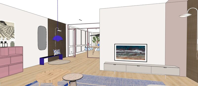 Daarom werkte ik meteen een volledig lichtplan uit, samen met een 3D ontwerp waarin alles samenkomt: meubels, styling, verlichting, maatwerk, kleuren en zelfs de planten.